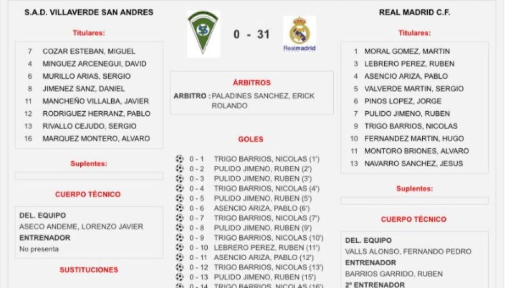 El Villaverde San Andrés ha mostrado su indignación en twitter al colgar el acta del partido en el que se muestra su derrota por 0-31 frente a los benjamines del Real Madrid. Critica a la Federación y a a actitud de los equipos grandes.