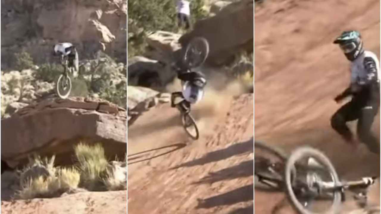 El piloto catalán Bienvenido Aguado intentó realizar una increíble pirueta en el Red Bull Rampage que acabó con una gran caída y con su bicicleta completamente partida.