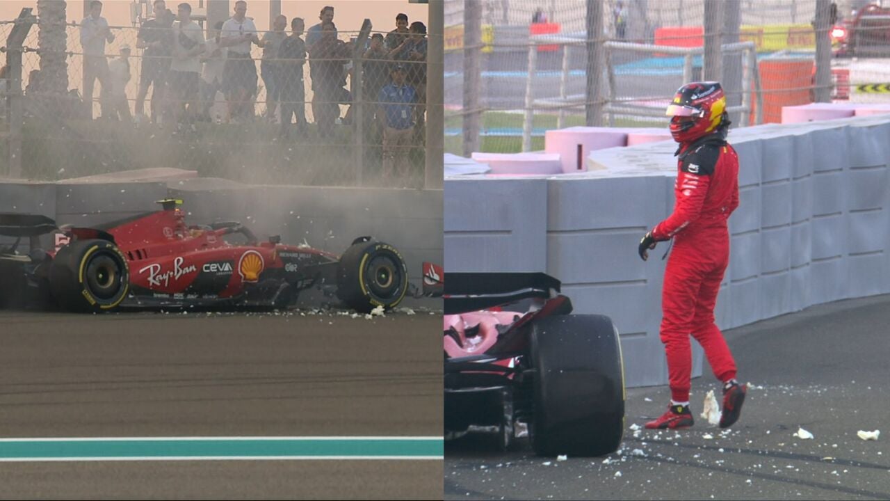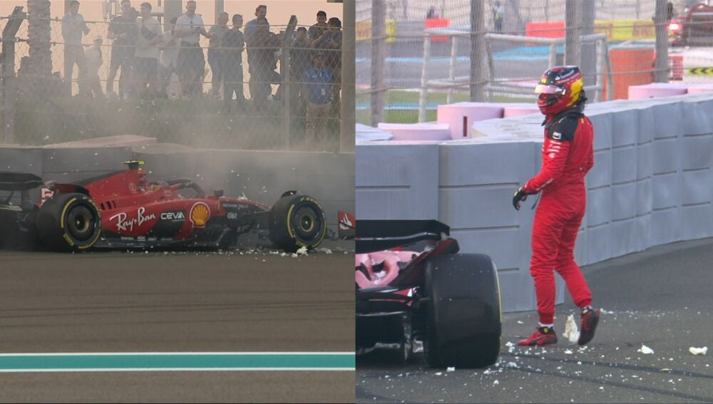 Carlos Sainz perdió el control de su Ferrari en el inicio de la segunda sesión de libres en Yas Marina y acabó chocando contra las protecciones. El madrileño salió ileso pero habrá que ver si deben cambiar piezas en su monoplaza que impliquen una sanción.