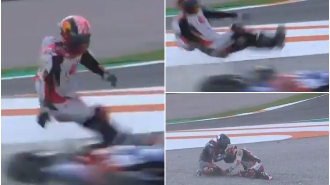 Johann Zarco sufrió una caída en Cheste. El francés se iba andando cuando fue arrollado por la moto del español Iker Lecuona, que también se había ido al suelo. Pese a lo espectacular del atropello, el piloto no sufrió consecuencias graves.