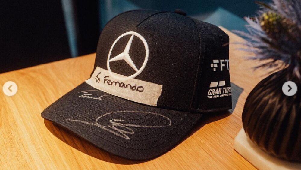 Junto al texto, Lewis adjuntaba varias fotos... y la última escondía un mensaje para Fernando Alonso: una gorra de Mercedes firmada por él y con una pegatina que no dejaba lugar a dudas y en la que se podía leer "Para Fernando".