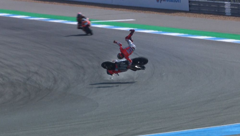 Sin embargo, en los Libres 2 la mala suerte se cebó con el piloto español. Al final de la recta, la rueda trasera patinó y Lorenzo salió volando por encima de la moto. El balear cayó sobre el pie maltrechoy la Ducati se rompió.