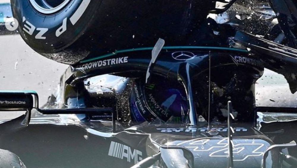 Verstappen y Hamilton se vieron envueltos en un accidente histórico y Lewis sabe que se lo debe todo al Halo: la rueda del Red Bull acabó sobre su cabeza.