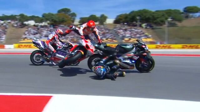 Márquez salió desde la pole tras terminar tercero en la carrera al sprint del sábado y en la carrera de hoy perdió hasta tres posiciones en la salida. El catalán marchaba 4º y cuando encaró una curva cerrada en la segunda vuelta cometió el error de entrar muy pasado de frenada y además de tocar a Jorge Martín se llevó por delante al portugués Oliveira cuando este marchaba segundo.