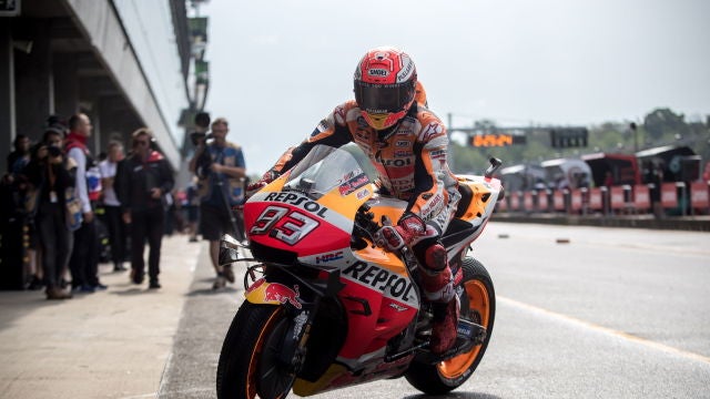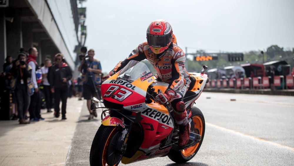 En una exhibición de osadía y pilotaje, Márquez arriesgó para llevarse, mientras la lluvia arreciaba y enfundado con neumáticos 'slicks', la primera posición con dos segundos y medio de ventaja sobre el segundo, el australiano Jack Miller (Ducati).