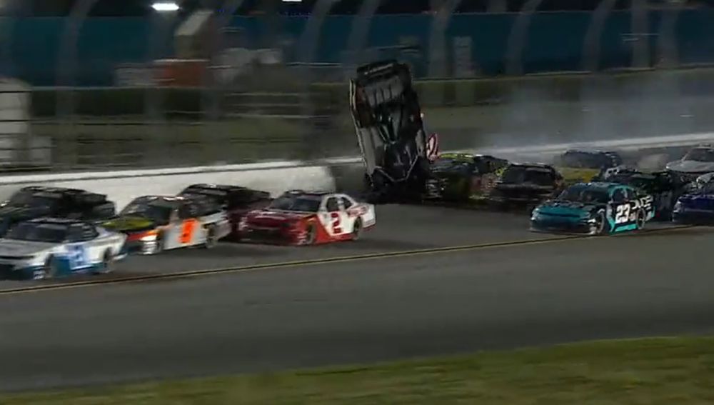 El coche de Myatt Snider perdió agarre en la última vuelta y chocó contra el muro para terminar dando una peligrosa vuelta de campana. El coche terminó ardiendo pero Snider salió ileso.