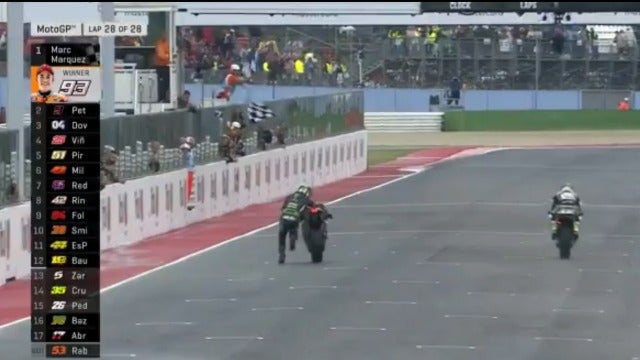 Zarcoestaba llegando a la meta en el circuito de San Marino de Moto GPcuando la moto le falló. La anécdota ha sido cuando el francés decidió seguir los metros que le quedaban llevando la moto a pie para poder puntuar.