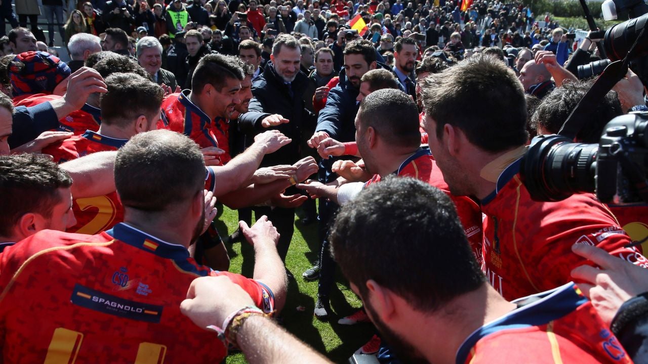 Tras el partido el monarca fue al césped a dar la enhorabuena a los jugadores e incluso hizo piña con los jugadores, hizo la ola y animó a los españoles en un día histórico para el rugby nacional que está cada vez más cerca de conseguir un pase para el Mundial.