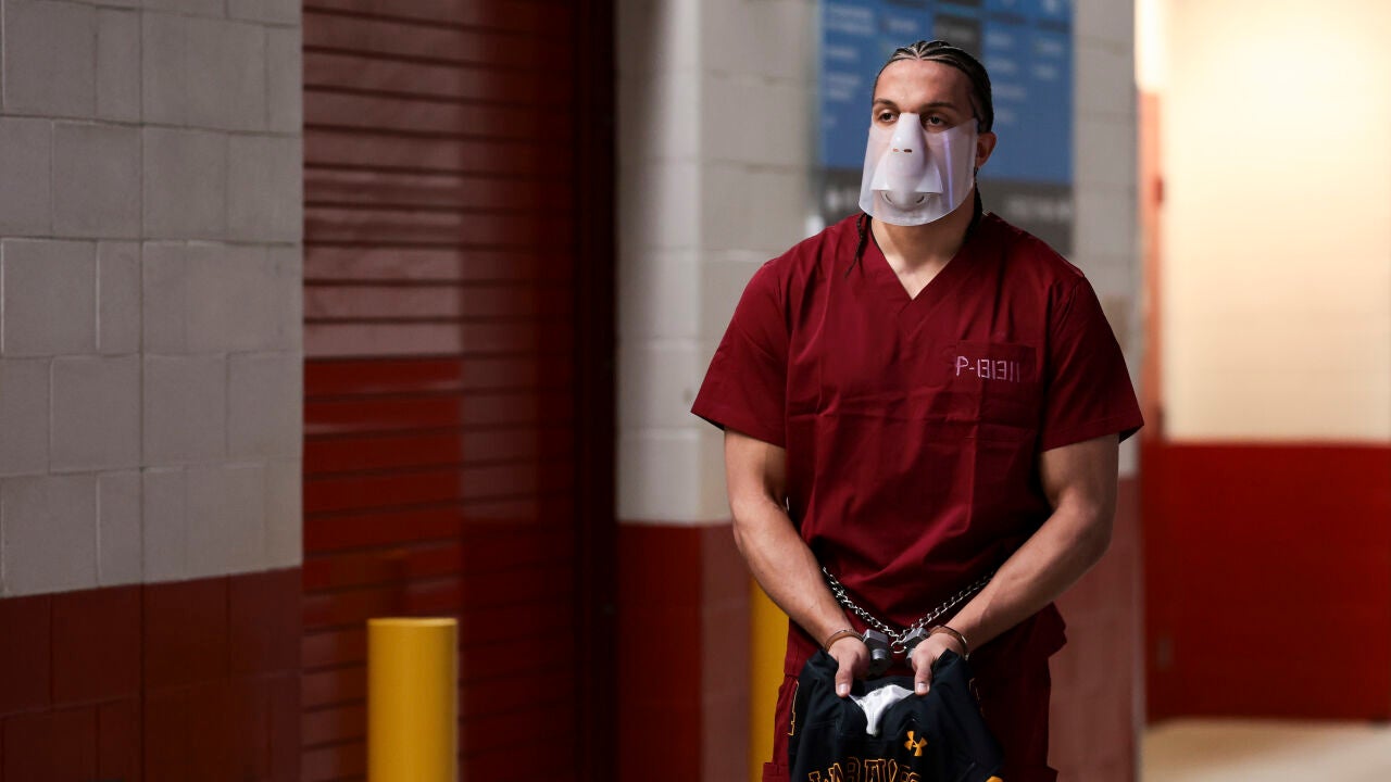 Mack Hollins, receptor de los New England Patriots y apodado como 'el Tarzán de la NFL', ha sido uno de los nombres más comentados de la Super Bowl LX después de que llegara al Levi's Stadium de Santa Clara con un atuendo que no dejó a nadie indiferente. El jugador de 32 años de Rockville, Maryland, apareció en el estadio enmascarado, con un uniforme de prisionero, esposado y descalzo, una vestimenta que recordó a la de Hannbal Lecter en El silencio de los corderos.