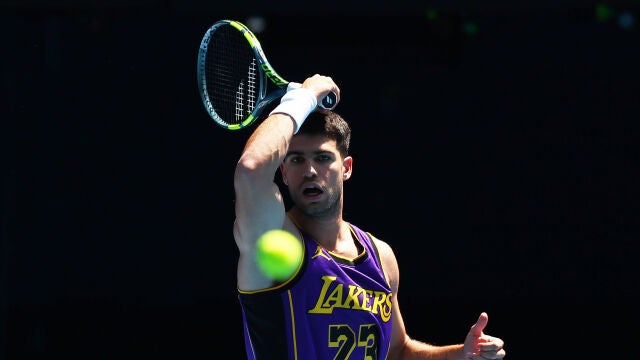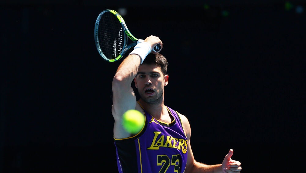 Carlos Alcaraz, número 1 del mundo, se entrenó este lunes en Melbourne para preparar el Abierto de Australia luciendo la camiseta del jugador de Los Ángeles Lakers Lebron James.