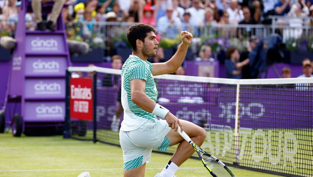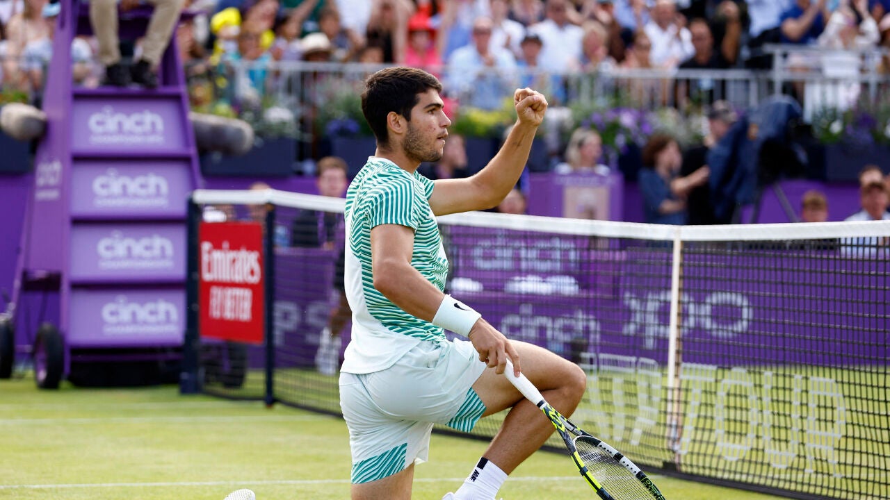 Carlos Alcaraz ya ha recordado lo que supone jugar sobre hierba. Tras su dolorosísima derrota en la semifinal de Roland Garros ante Novak Djokovic, el murciano se estrenó en el torneo de Queen's con una sufrida victoria ante el francés Arthur Rinderknech, quien ganó el primer set y llegó a colocarse con 0-2 en el tercer set. Pero la garra del tenista de El Palmar impidió una despedida a las primeras de cambio.