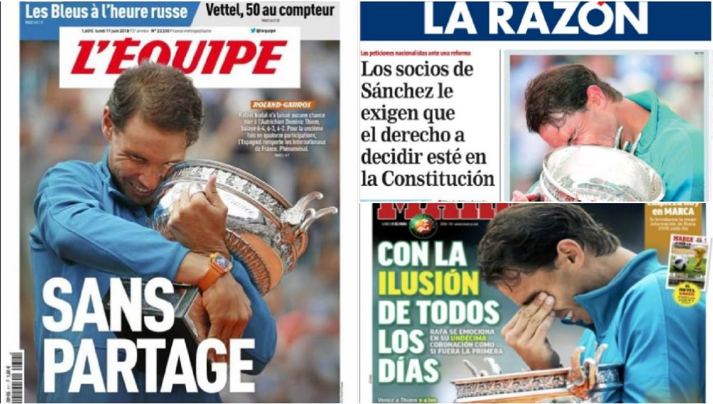 El diario La Razón' dedica su portada al campeón español con la fotografía de un Nadal emocionado con el trofeo de Roland Garros. Este periódico titula "Nadal. Rey de la tierra". Y destaca que gana su "undécimo Roland Garros".