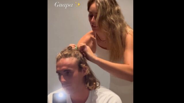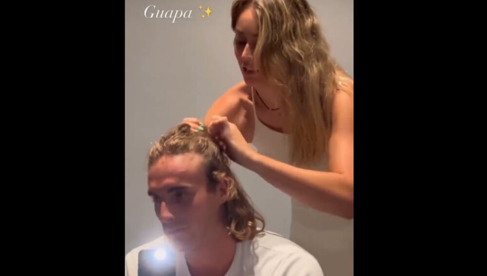 En uno de los últimos vídeos filtrados en redes sociales se puede apreciar a Paula Badosa haciéndole un moño en el pelo al griego y dándole un beso en la mejilla.