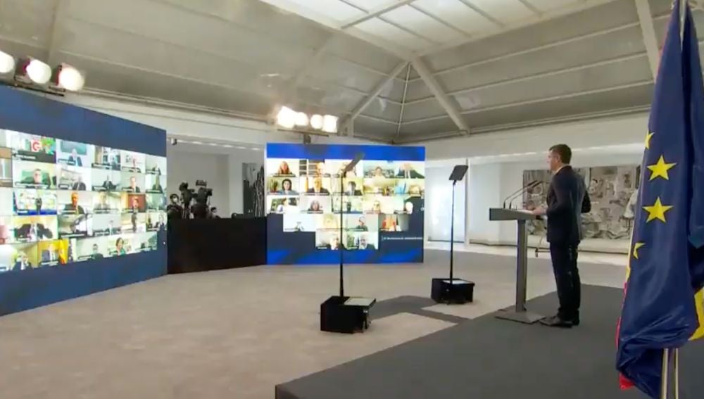 La presentación del Plan de Recuperación se ha realizado por videoconferencia, a la que se han conectado todos los miembros del Ejecutivo, la patronal y los sindicatos, así como los embajadores de los 27 países miembros de la UE. Pedro Sánchez ha presentado las claves y ha dicho que los tres primeros años concentrarán un presupuesto de 72.000 millones de euros para acelerar la recuperación económica tras la crisis del coronavirus.