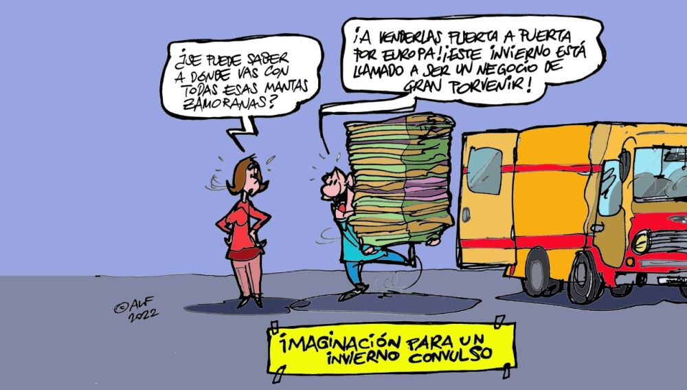 Alfredo Boto-Hervás ha querido dedicar su viñeta gráfica de la semana a este tema. En la imagen se observa a una mujer que pregunta extrañada: "¿Se puede saber a dónde vas con todas esas mantas zamoranas?". A su lado un vendedor que responde vehemente: "A venderlas puerta a puerta por Europa. Este invierno está llamado a ser un negocio de gran porvenir".