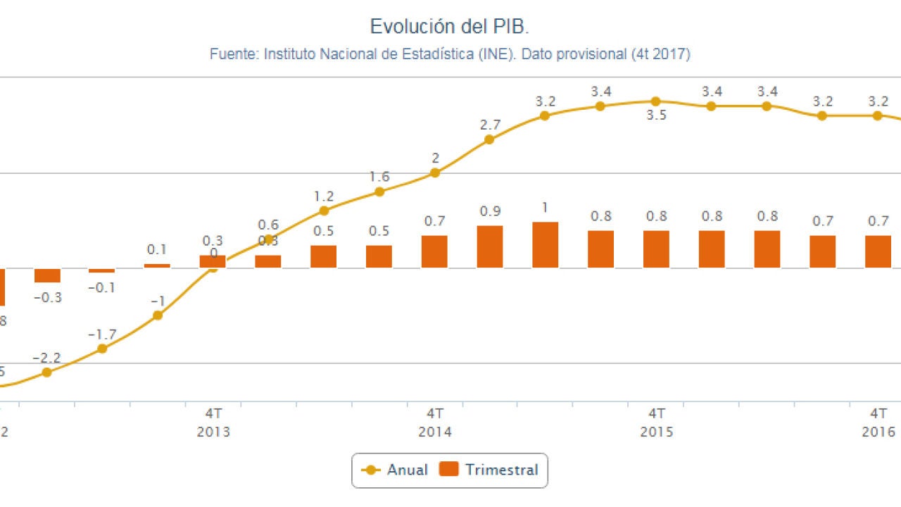 La economía española creció el 3,1 % en 2017, con lo que suma cuatro años de recuperación y tres años consecutivos creciendo por encima del 3%, de acuerdo con el avance del PIB publicado por el Instituto Nacional de Estadística (INE).