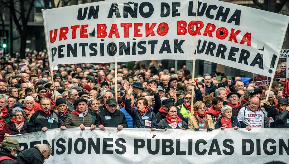 Los pensionistas de Bilbao continúan manifestándose cada día por sus pensiones. La manifestación de este lunes coincide con el informe del BBVA que asegura que van a necesitar 10 millones de euros más para pagar las pensiones en 2050.