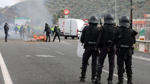 En Antequera la protesta se ha desarrollado en el kilómetro 86, y un grupo de agricultores de la plataforma 6F ha cortado a las 8:00 la autovía AP-7 en Los Alcázares (Murcia) en ambos sentidos, pero han sido disueltos por antidisturbios.