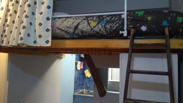 En las fotografías publicadas en el anuncio de Idealista puede verse como una escalera conecta con una cama, que se sostiene por una tabla y que está "tapada" por una pequeña cortina para mayor privacidad. ¿Te apetece ver la televisión desde la cama? Más fácil imposible.