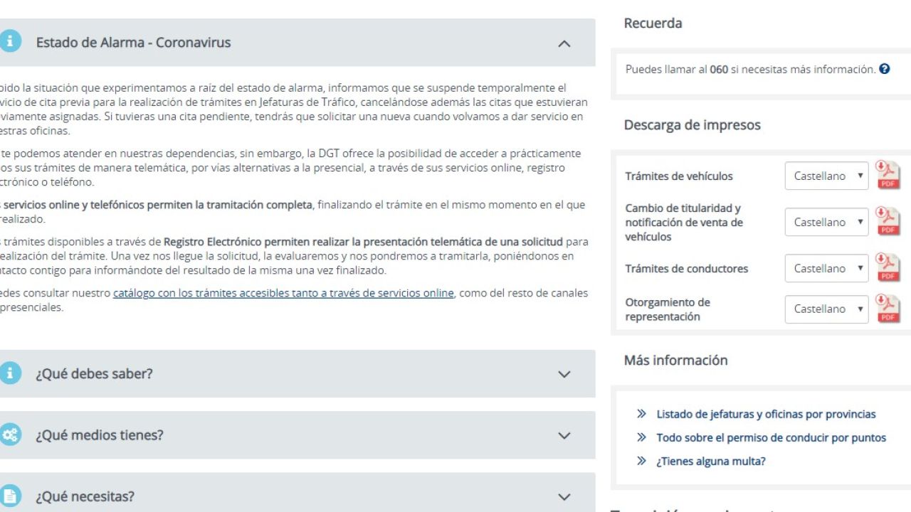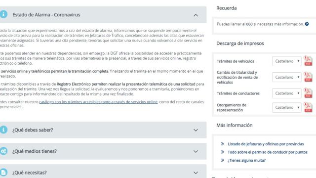 La DGT trata de mantener el contacto con los usuarios de forma totalmente virtual. Su página web recoge la nueva situación y facilita a quienes lo necesiten descargarse documentos e iniciar trámites no presenciales. Se han cancelado todas las citas previas, se han suspendido temporalmente los exámenes de conducir, se ha cesado temporalmente la actividad en todas las jefaturas provinciales de Tráfico.