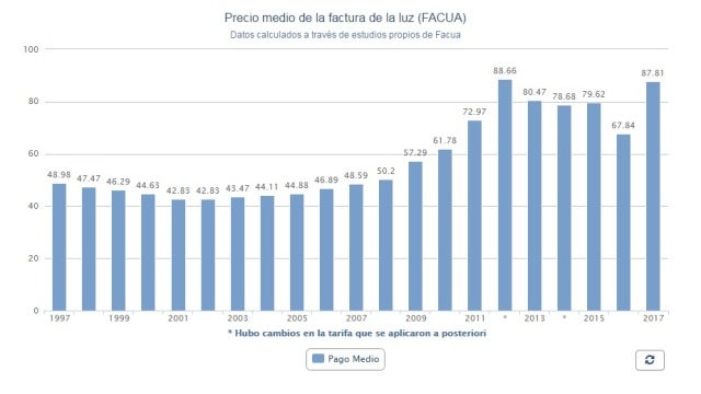 Así, el portavoz de Facua, Rubén Sánchez, ha señalado que el recibo de este mes de enero estará por encima de los anteriores máximos históricos, que se produjeron en julio de 2015, mes en que la facturación del usuario medio alcanzó los 81,18 euros, y entre enero y marzo de 2012, cuando se situó en los 74 euros, aunque posteriormente se procedió a una refacturación como consecuencia de una sentencia del Tribunal Supremo que elevó el importe a 88,66 euros.