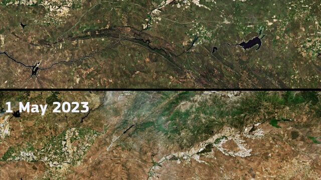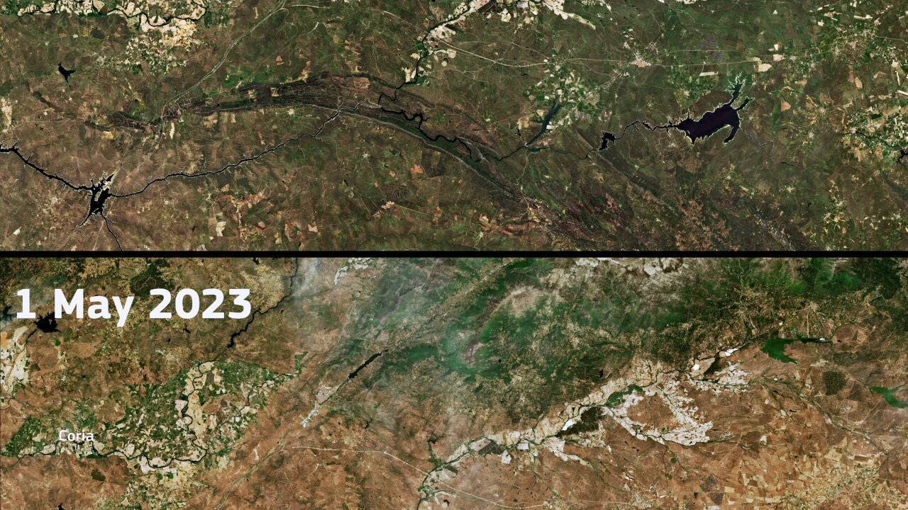 En las imágenes se puede ver los impactos de la severa sequía que sufre Extremadura que ha perdido su típico color verde, como se evidencia al comparar las imágenes de Sentinel2 de mayo de 2022 y 2023.