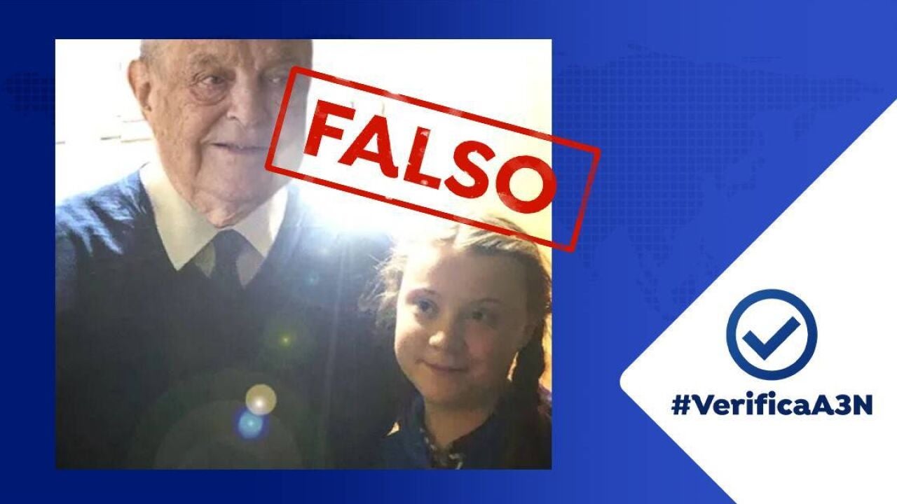 Vuelve a circular por redes sociales una imagen manipulada de Greta Thungberg junto a George Soros afirmando que son familiares, en concreto nieta y abuelo. Es falso.