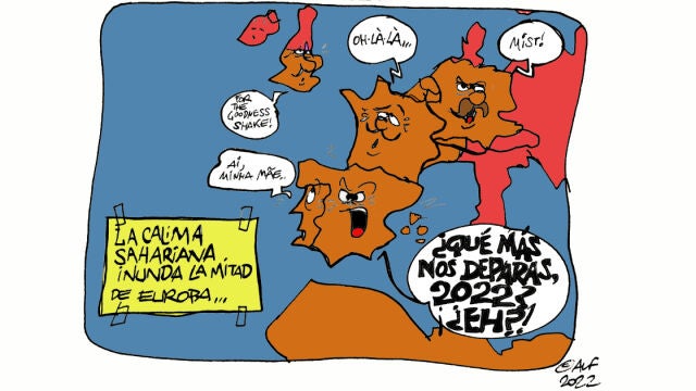 Tal ha sido el paisaje anaranjado que ha dejado la calima durante estos días que muchos no hablan de otra cosa y se preguntan: ¿Qué más nos deparará el 2022?. Así queda reflejado en la viñeta gráfica de Alfredo Boto-Hervás, en la que aparecen cubiertos de polvo España, Francia, Alemania y parte de Reino Unido.