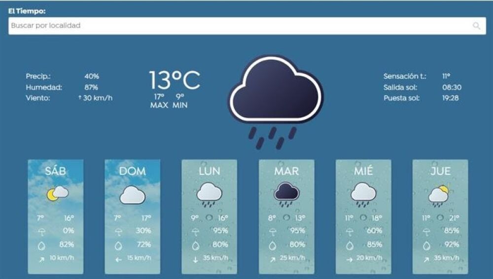 En el nuevo buscador interactivo de Tu Tiempo podrás comprobar el tiempo en tu ciudad en los próximos 7 días, así como los detalles de temperaturas, lluvias, viento y humedad, entre otros.