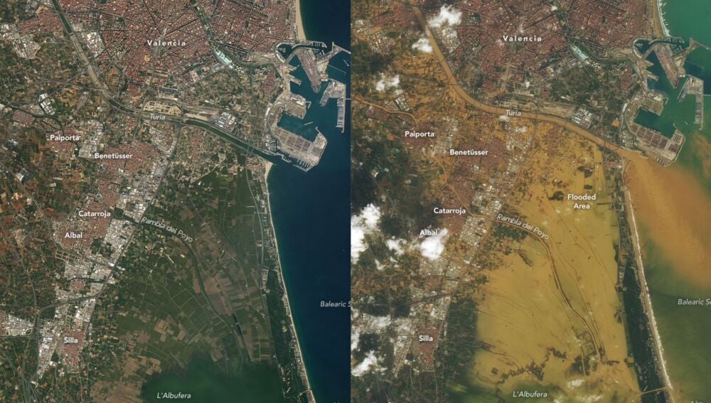 Por su parte, la segunda imagen, capturada el 30 de octubre de 2024 después las fuertes lluvias, muestra grandes extensiones de tierra inundadas y una área cubierta de agua lodosa. La zona agrícola al sur y sureste de Valencia, cercana a L'Albufera, aparece anegada, mientras que el río Turia, ahora cargado de sedimentos, presenta un color marrón oscuro y un cauce más ancho, indicando desbordamientos. La costa también muestra la presencia de agua turbia en el mar Balear, resultado de la descarga de agua y sedimentos provenientes de las inundaciones en tierra.