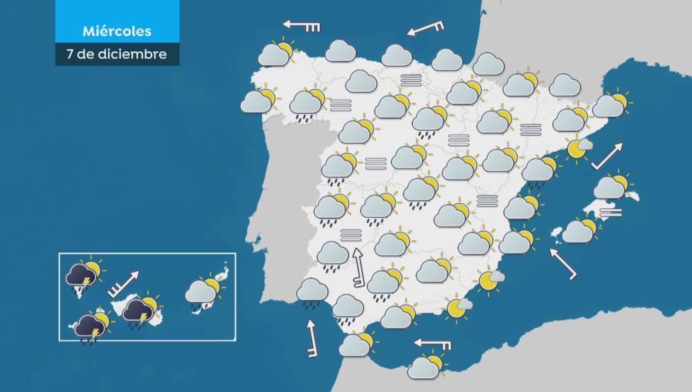 En la segunda mitad del miércoles los chubascos entrarán de nuevo por el oeste y se mantendrán durante el jueves, Día de la Inmaculada. Precipitaciones sobre todo en zonas occidentales, aunque tampoco se descartan en puntos orientales y en ambos archipiélagos.