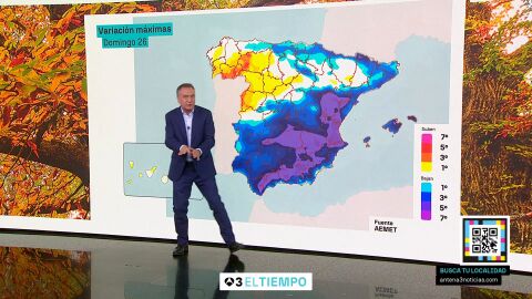 Coincidiendo con el estreno del horario de invierno, nos llega el domingo un descenso de las temperaturas en toda la Península y Baleares. Bajarán 8 grados o más en el sureste y zonas del este peninsular, solo que aquí, al estar tan altas, no podemos hablar de frío, sino de menos calor: 21° en Valencia, 25° en Alicante, 26° en Murcia, todavía llegaremos a 28°. En Madrid la máxima será de 19° y en Burgos amaneceremos con 3°, en Ávila con 5° o en Cuenca con 6°. Ahí es donde se notará más el frío: en el interior de la mitad norte y a primera hora del día.