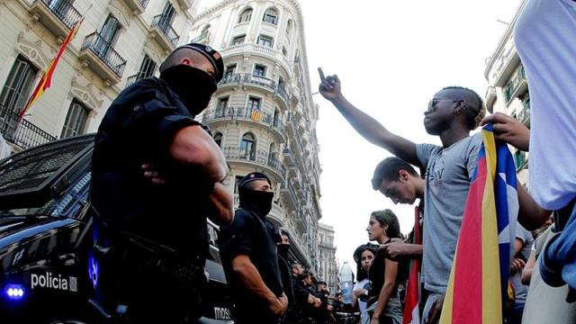 Varias furgonetas de los Mossos d'Esquadra, con algunos agentes firmes ante los manifestantes, permanecen estacionadas a modo de barrera ante el edificio de Jefatura para proteger la instalación, en cuyas calles adyacentes hay más furgones de la propia Policía Nacional.