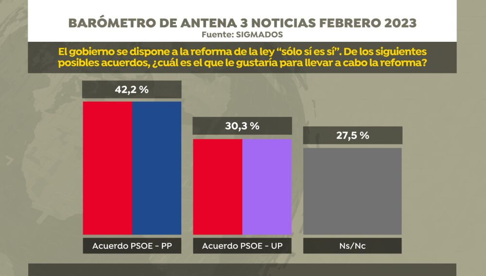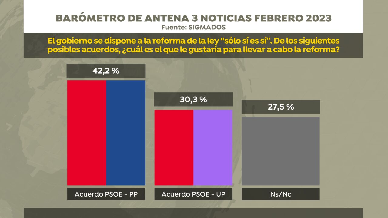 El barómetro de Sigma Dos para Antena 3 Noticias refleja que el 42,2% de los españoles es partidario de un acuerdo entre PSOE y PP para modificar la ley de Libertad Sexual. Por otro lado, el 30,3% de la población valora que el PSOE y Unidas Podemos conseguirían alcanzar a un mejor acuerdo para corregir la norma.