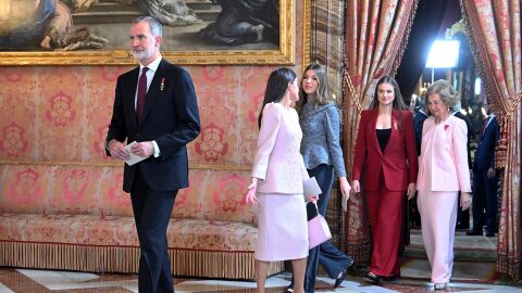 Un centenar de invitados han acudido al primer acto institucional, que se ha celebrado a las 10:30 horas en el Palacio Real de Madrid y en el que se impondrá la insignia de la Orden del Toisón de Oro, la máxima distinción de la Corona a la reina Sofía, al expresidente del Gobierno Felipe González Márquez y a los padres de la Constitución Miguel Herrero y Rodríguez de Miñón y Miquel Roca.