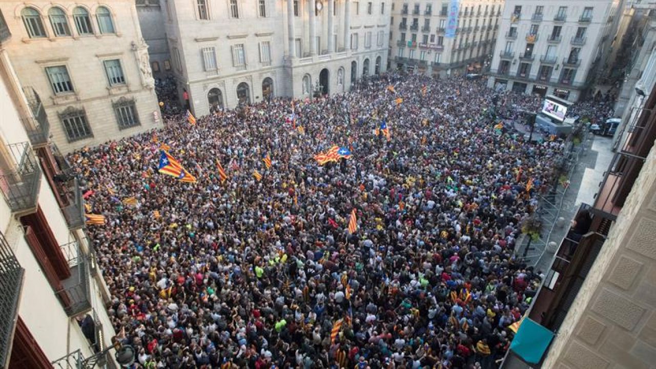La plaza Sant Jaumesupera las 17.000 personas concentradas sobre las 19 horas -según la Guardia Urbana- ante el Palau de la Generalitat y el Ayuntamiento de Barcelona tras proclamarse la República catalana.