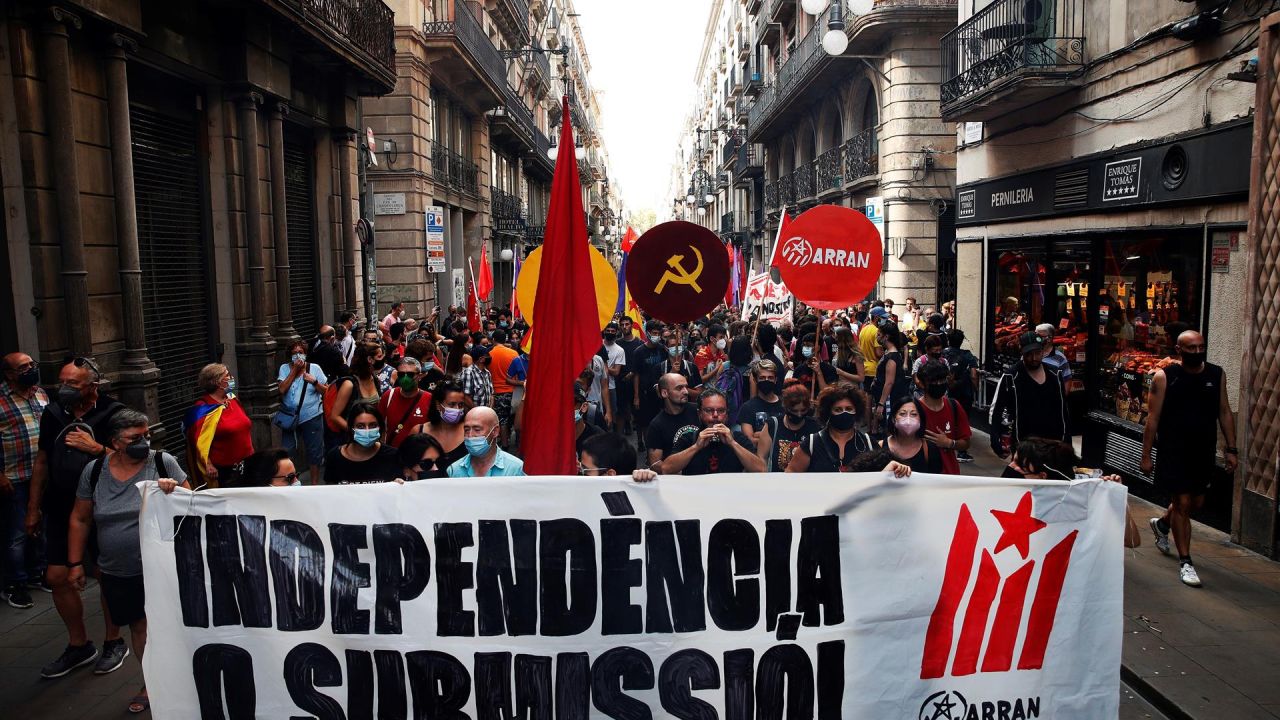La marcha ha salido de la calle Ferran, ha hecho una parada de homenaje a Gustau Muñoz y posteriormente, después de la quema de fotografías, se ha dirigido hacia el Born. En el lema que encabezaba la protesta se podía leer 'Independencia o sumisión'. Otros de los mensajes que han portados los asistentes eran 'Fuera burguesía catalana' o 'Ni patriarcado, ni España. Países Catalanes libres'. También se han producido pintadas contra comercios a lo largo del recorrido.