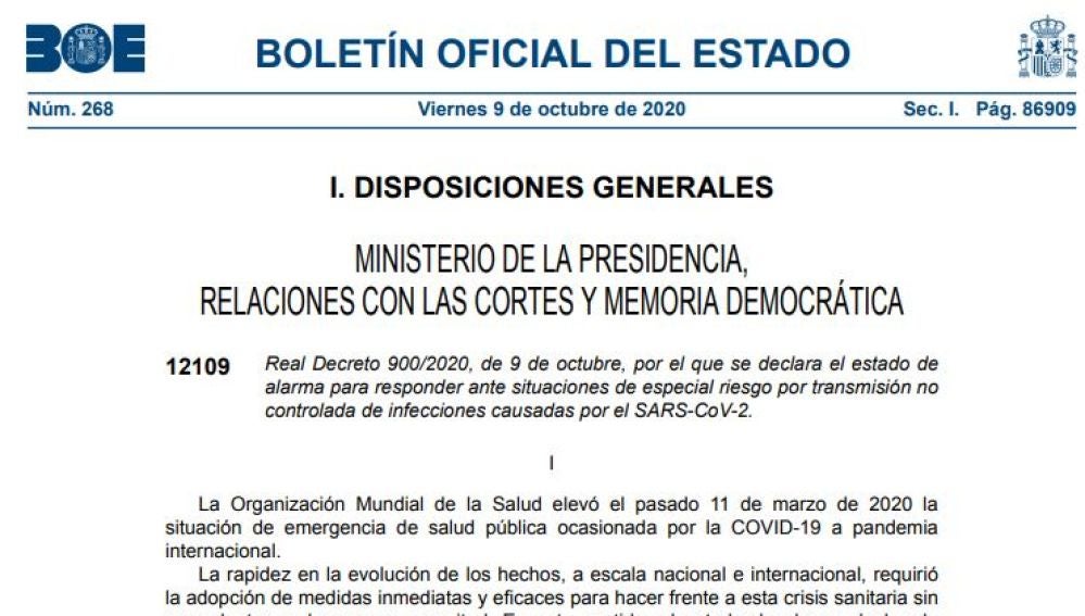El estado de alarma ha sido aprobado en un Consejo de Ministros extraordinario, presidido por Carmen Calvo, y el decreto ha sido recogido en el BOE de hoy 9 de octubre de 2020.