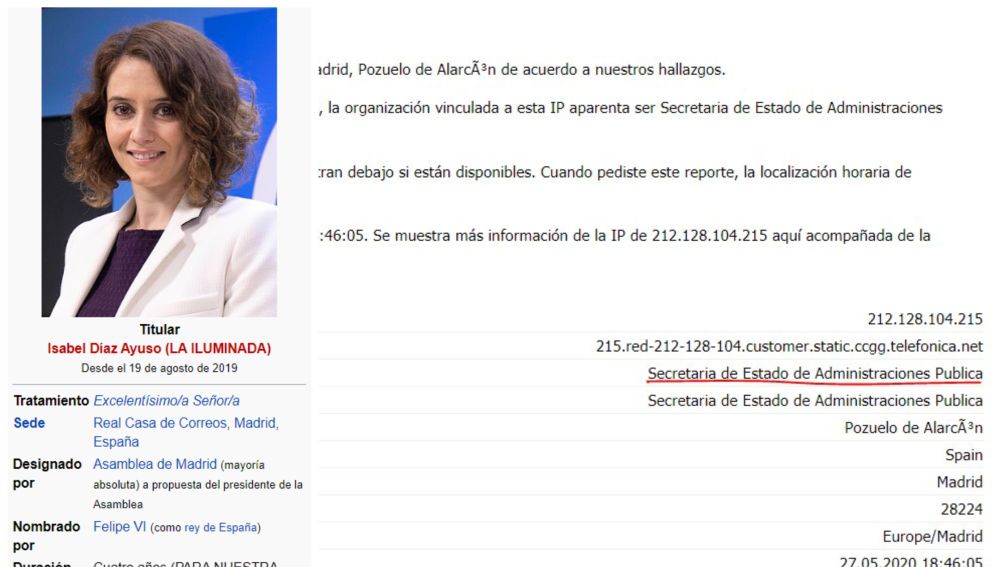 La página de Wikipedia que ofrece información sobre la presidenta de la Comunidad de Madrid, Isabel Díaz Ayuso, ha sido saboteada este viernes desde un ordenador cuya IP pertenecería a la Secretaría de Estado de Administraciones Públicas, dependiente del Gobierno.