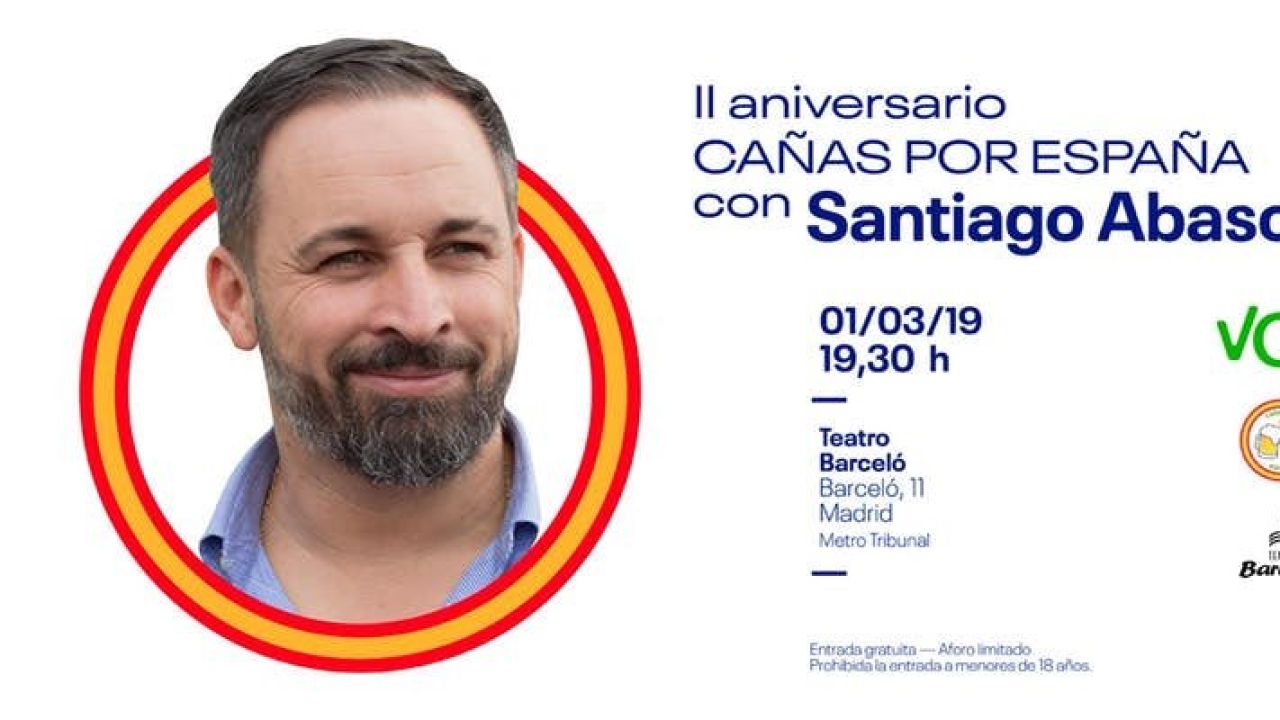 El próximo 1 de marzo el líder de Vox, Santiago Abascal, tendrá un encuentro con jóvenes en la sala Teatro Barceló de Madrid. Los organizadores del evento 'Cañas por España' han anunciado que se han acabado las 700 entradas disponibles en la modalidad de reserva en menos de 4 horas.