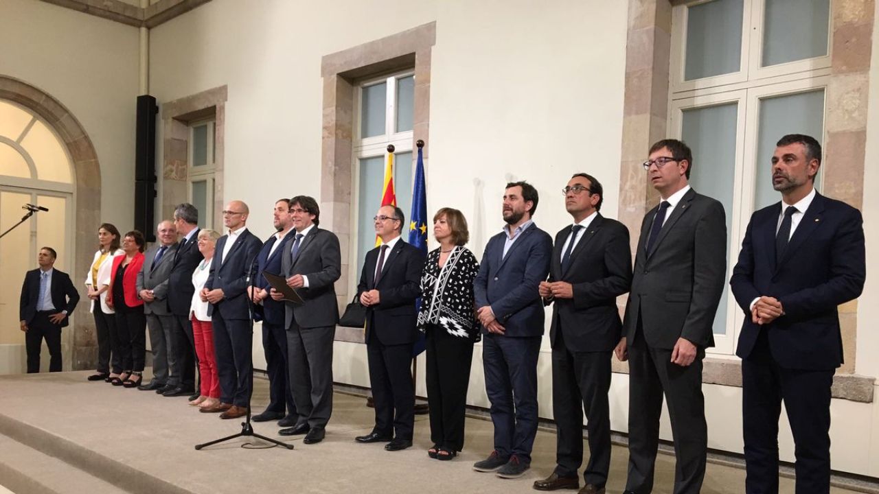 El presidente de la Generalitat, Carles Puigdemont, y sus consellers han firmado esta noche en el Parlamento catalán el decreto de convocatoria del referéndum soberanista para el 1 de octubre, poco después de que el pleno haya aprobado una ley, con el apoyo de Junts pel Sí y la CUP, para darle amparo legal.