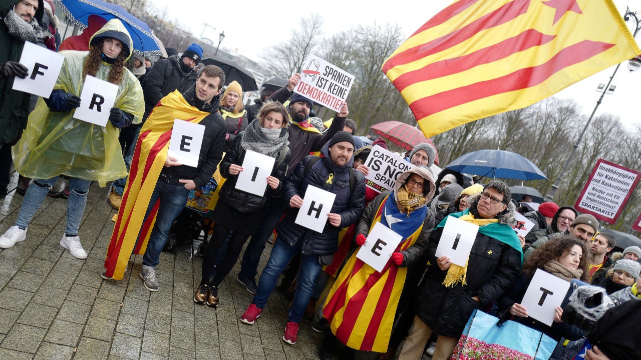 Con esteladas (banderas independentistas) y entre gritos de 'Freiheit Puigdemont' (Libertad Puigdemont), los manifestantes partieron de la Puerta de Brandeburgo en dirección al Ministerio de Justicia y pasaron ante la delegación de Schleswig-Holstein, estado federado donde fue detenido el político catalán y cuyas autoridades judiciales deben decidir sobre la euroorden dictada por España.