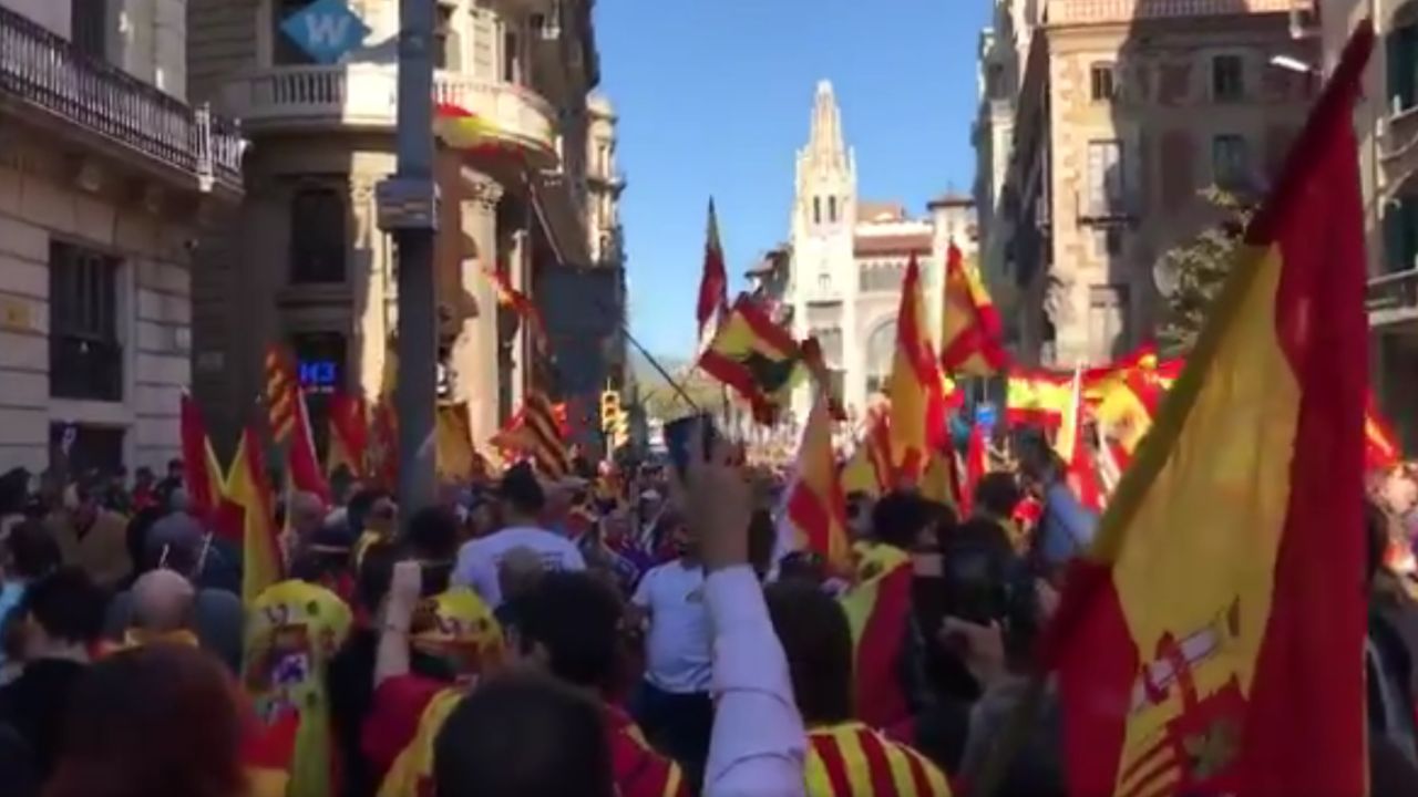 Los manifestantes, ataviados la mayoría de ellos con banderas españolas y catalanas, han coreado lemas a favor de la unidad de España y de las Fuerzas y Cuerpos de Seguridad del Estado, y han cantado y bailado al ritmo de "Que viva España" y el himno nacional.