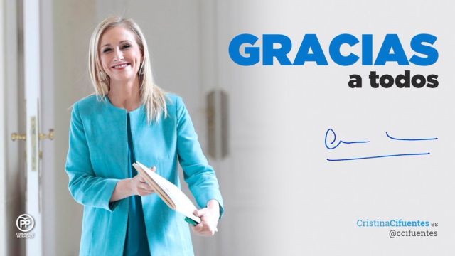 "Gracias a todos. Gracias por estar ahí. Sabéis que esté donde esté en cada momento, siempre podréis contar conmigo", concluye en su texto Cifuentes, que permanece aún como diputada en la Asamblea de Madrid con dedicación exclusiva.