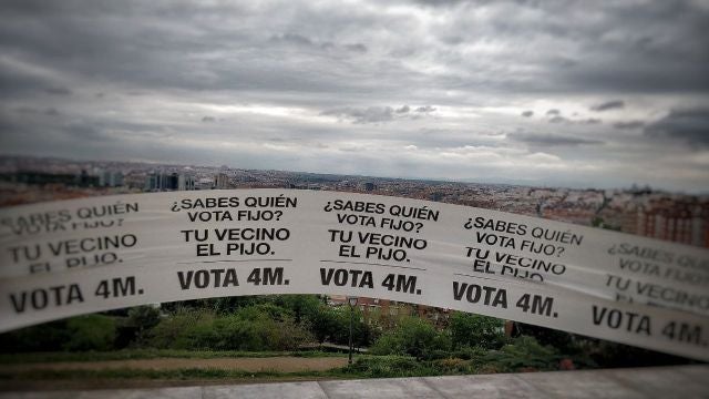 La plataforma #Defiéndete4M ha colocado una pancarta de un kilómetro con el lema "quien vota fijo es tu vecino el pijo" en el Parque de las Tetas situado en el barrio de Vallecas, en Madrid, con el objetivo de movilizar al voto progresista en las próximas Elecciones a la Asamblea de Madrid que se celebran el próximo 4 de mayo.