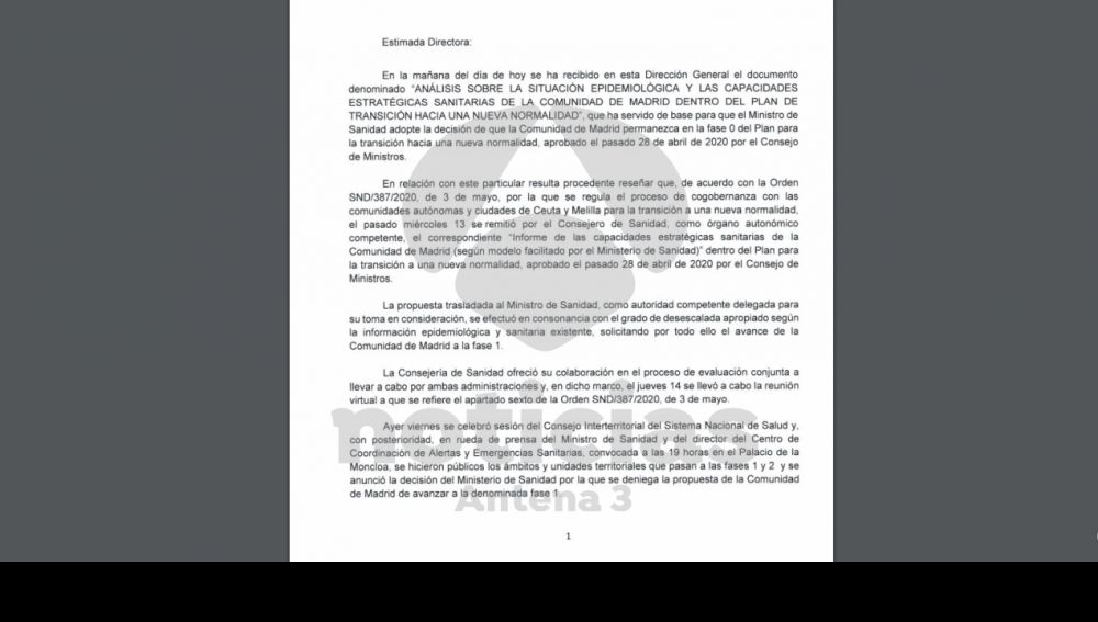 La carta remitida a la Directora General de Salud Pública, Doña Pilar Aparicio Azcárraga, denuncia el hecho de que la firma del análisis de la situación epidemiológica se produjo varias horas después de que el ministro de Sanidad, Salvador Illa, anunciara que Madrid no pasaría a la fase 1 de la desescalada del coronavirus. Esta carta remitida a Sanidad, que lleva la firma de Elena Andradas Aragonés, debate cada uno de los puntos del informe sobre los criterios que no han permitido a Madrid pasar de fase.