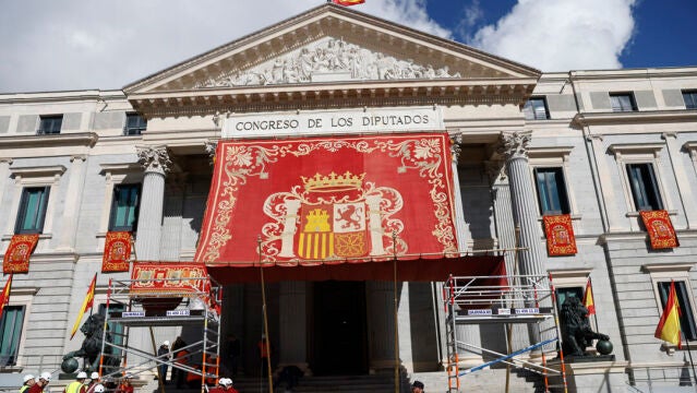 Además de la colocación de nuevos asientos en el hemiciclo, con asientos tapizados de color rojo, el símbolo más evidente de esta ceremonia ya es visible desde el exterior de la carrera de San Jerónimo: hoy los operarios han comenzado el montaje del "baldaquino", un gran toldo con el escudo de España en el centro que se ubica tradicionalmente en el atrio del Congreso, en la conocida como "Puerta de los Leones".