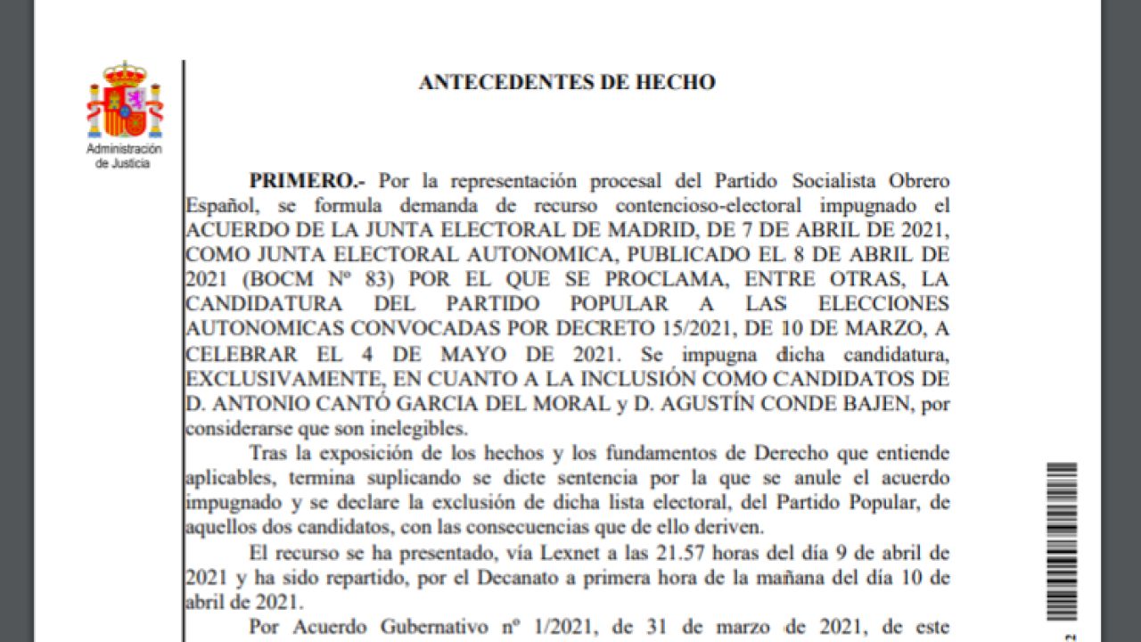 Consulta el PDF completo de la sentencia del juzgado de lo contencioso administrativo número 5 de Madrid por el que Toni Cantó y Agustín Conde han quedado fuera de la lista del PP en las elecciones de Madrid.
