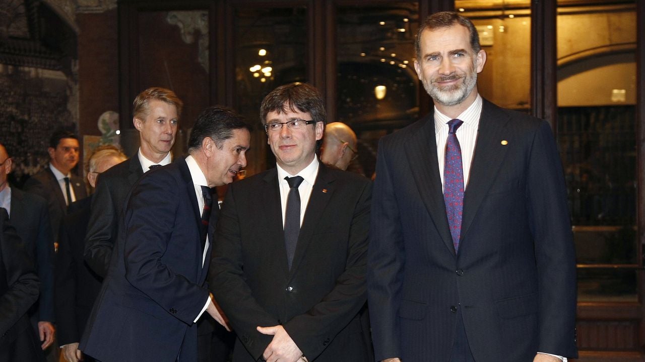 Sobre las 19.30 horas, Felipe VI ha llegado a las puertas del Palau de la Música, donde, al bajarse del vehículo oficial, le aguardaban Puigdemont, la alcaldesa de Barcelona, Ada Colau, y el ministro de Energía, Turismo y Agenda Digital, Álvaro Nadal. Don Felipe ha llegado acompañado de la vicepresidenta del Gobierno, Soraya Sáenz de Santamaría, y del delegado del Ejecutivo en Cataluña, Enric Millo.
