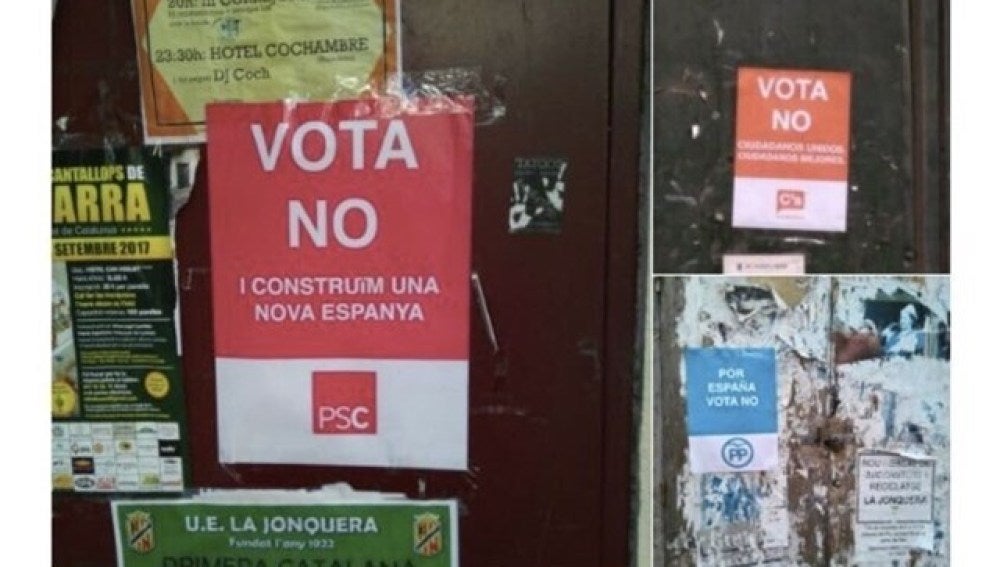 En el cartel del PSC puede leerse 'Vota 'no' y construyamos una nueva España'; en el de Cs, 'Vota 'no'. Ciudadanos unidos, ciudadanos mejores', y en el del PP, 'Por España, vota 'no'.